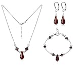 I bought this as a last-minute Christmas gift for my wife. She was quite happy with it, and I think it looks terrific on her. She wore it on New Year's Eve and received some compliments (what woman doesn't love that?)Get more detail about Garnet Swarovski Crystal Silver Bracelet Earrings 16" to 24" Necklace Set.